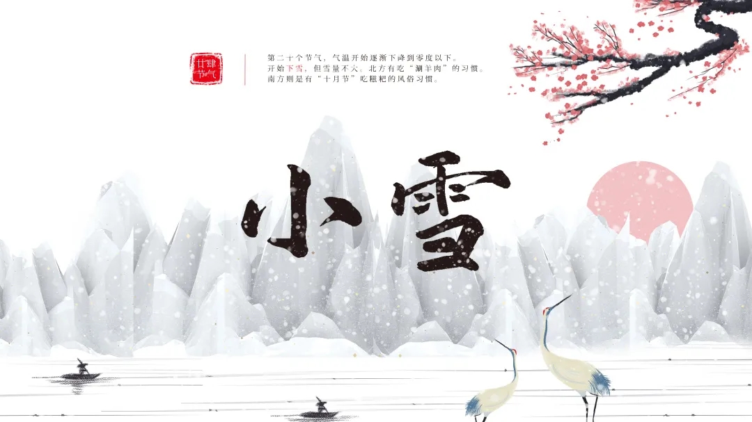 《月令七十二候集解》曰:“十月中,雨下而為寒氣所薄,故凝而為雪。小者未盛之辭。”小雪是反映氣候特征的節(jié)氣。冬為藏、為終,小雪節(jié)氣后期,萬物失去生機(jī),天地閉塞而轉(zhuǎn)入嚴(yán)寒的冬天。